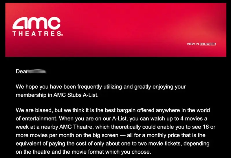 美国连锁电影院AMC Theatres表示,旗下订阅制服务「AMC Stubs A-List」将自年7月15日起调涨月费2美元。(受访者提供)