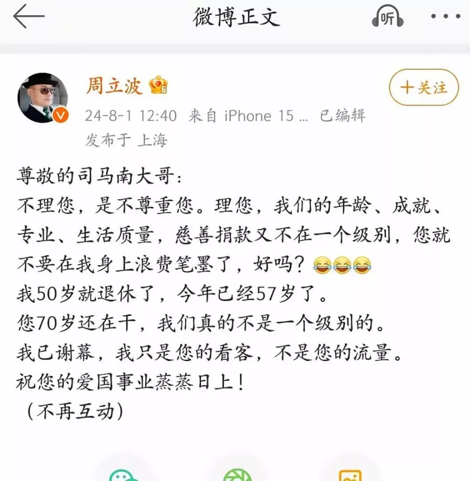 到了2024年,国内网友发现他的社交媒体账号又被禁言了。原因是他发表了一番“军舰重要,但饺子比军舰更重要”的争议言论,并因此和网络名人司马南爆发了一场激烈的骂战。这距离他上一次因为不当言论被封号,才过去没多久。 看来,即便远离了舞台,他这张惹祸的嘴,还是没能管住。