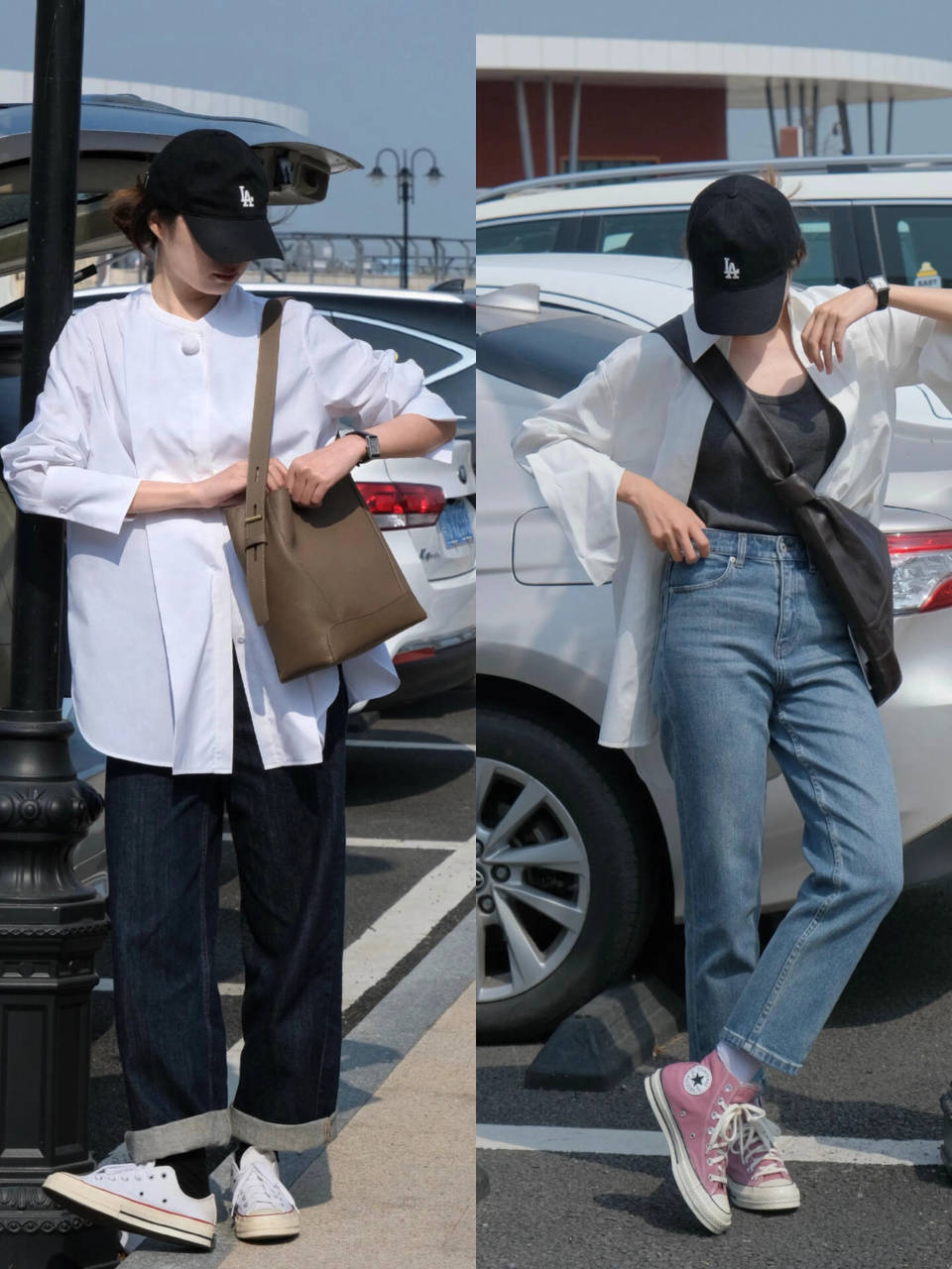 简简单单的一件白色衬衫搭配上牛仔裤时,若想要增加造型的运动元素,咱们确实可以选择一双白色帆布鞋或者是粉色的低帮帆布鞋来点缀,注入休闲元素,让整体造型更显活力。
