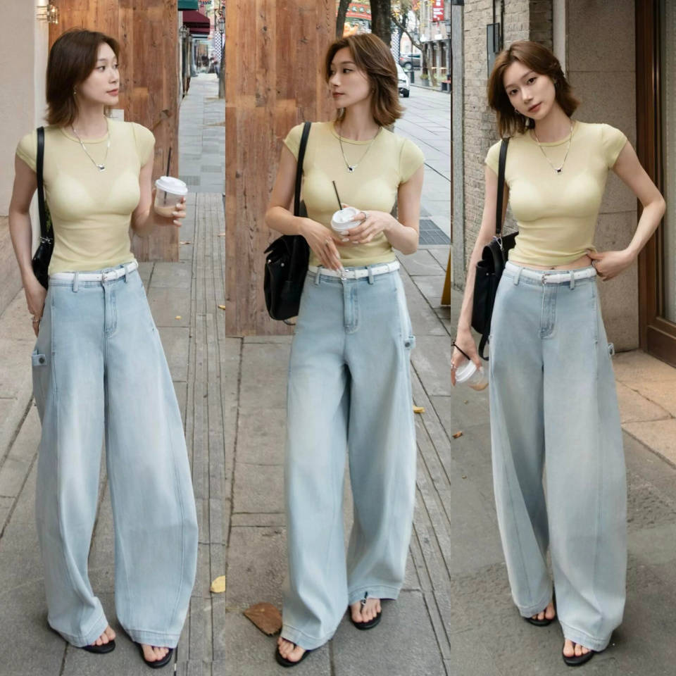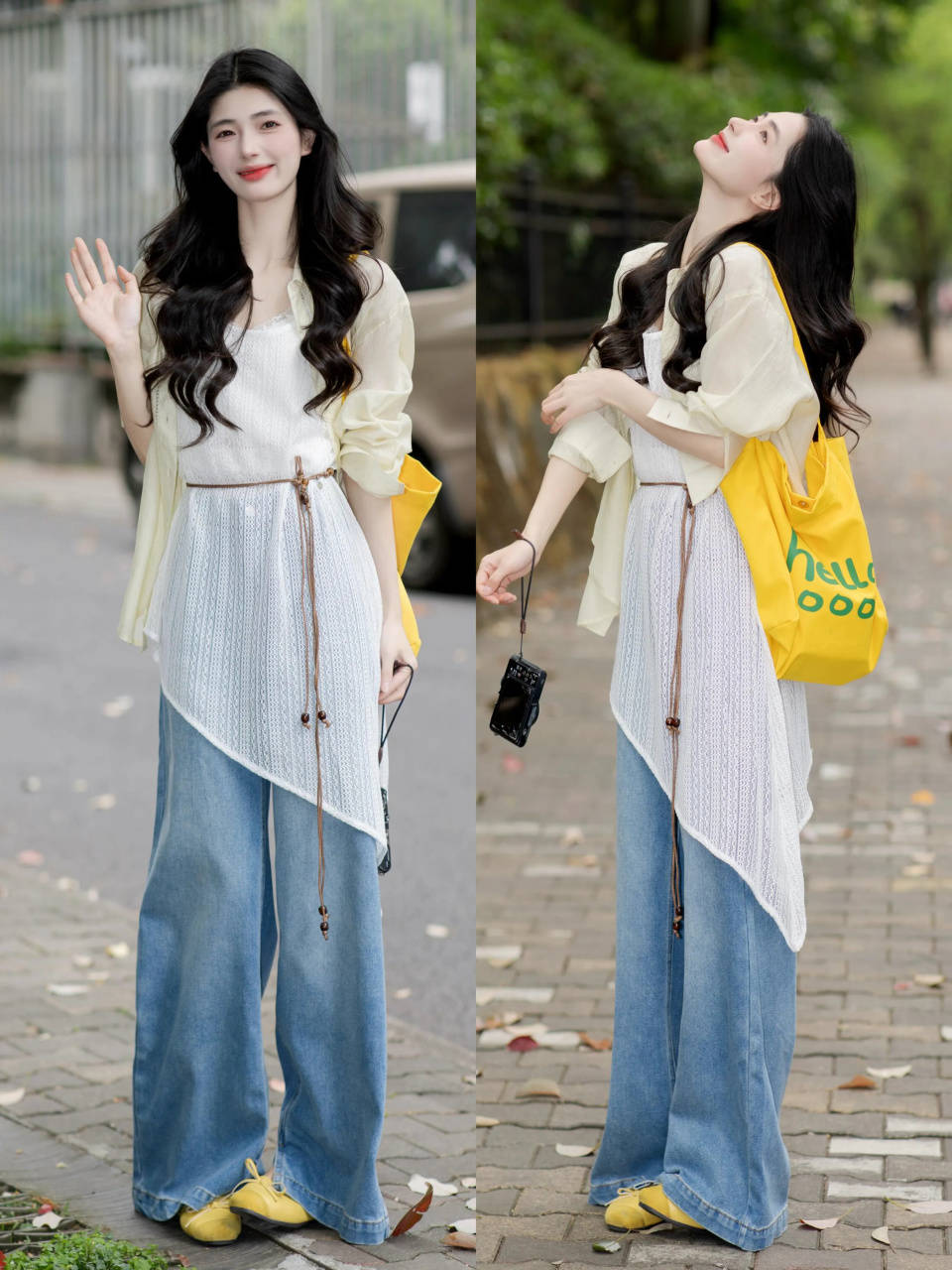 身材高挑纤瘦。这时不妨可以选择一条牛仔拖地裤,配上一件小众的白色长款衬衫上衣外搭。浅鹅黄色的衬衫,穿搭的时候在腰间系上腰带,形成高腰线,使得身材变成三七分。瞬间打破单调,让整体穿搭有着春日的明媚氛围感。