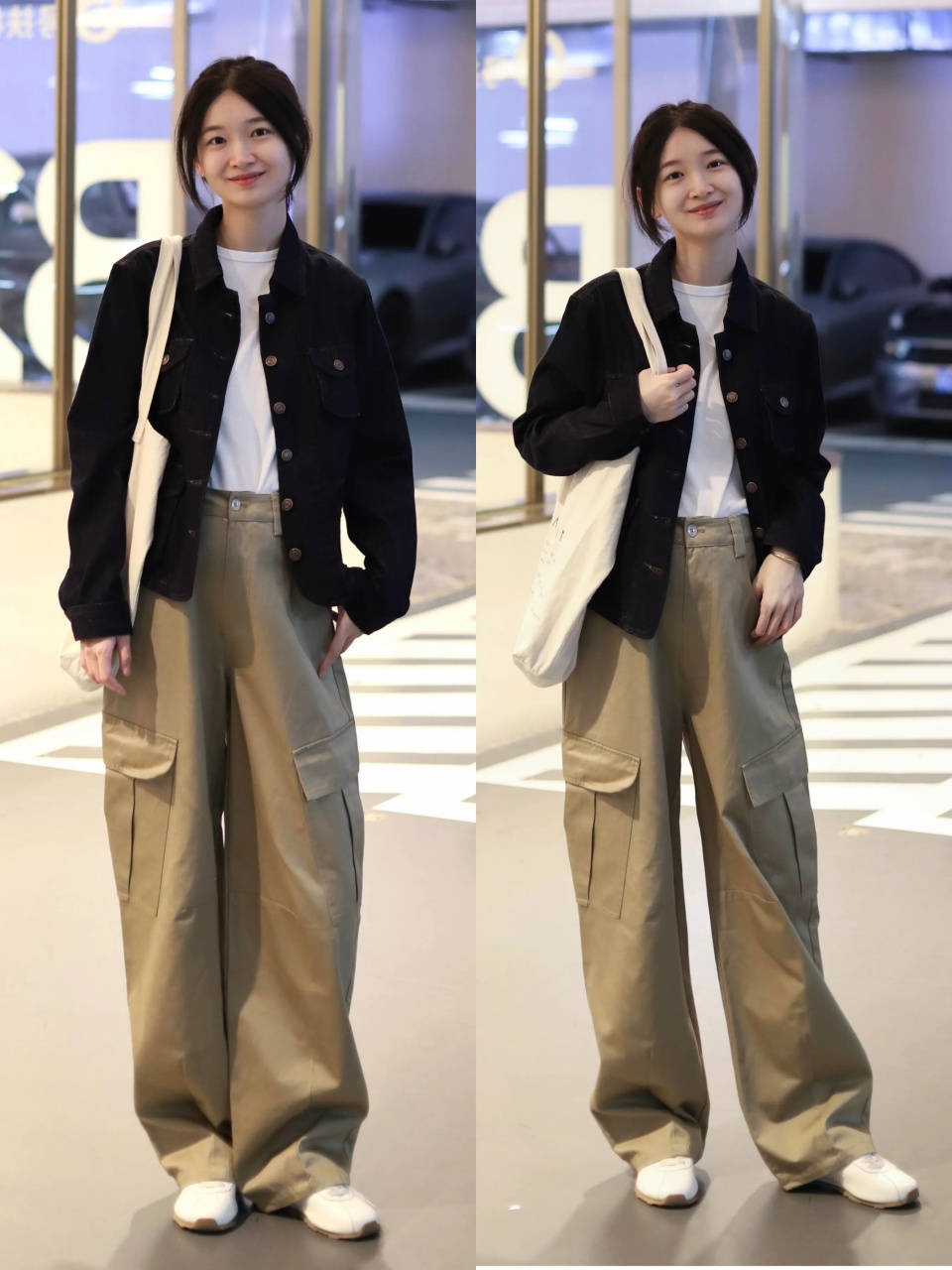 或是选择一件牛仔夹克外套,内搭白 T 恤和一条卡其色的工装阔腿裤,脚踩一双小白鞋,简约耐看。