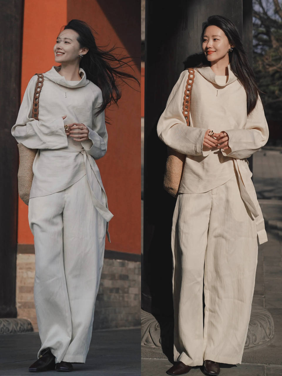 穿了一条西装阔腿裤,这时不想太过于呆板,正式可选棉麻材质的白色阔腿裤,穿在身上垂坠感十足,又呈现出一种休闲感。