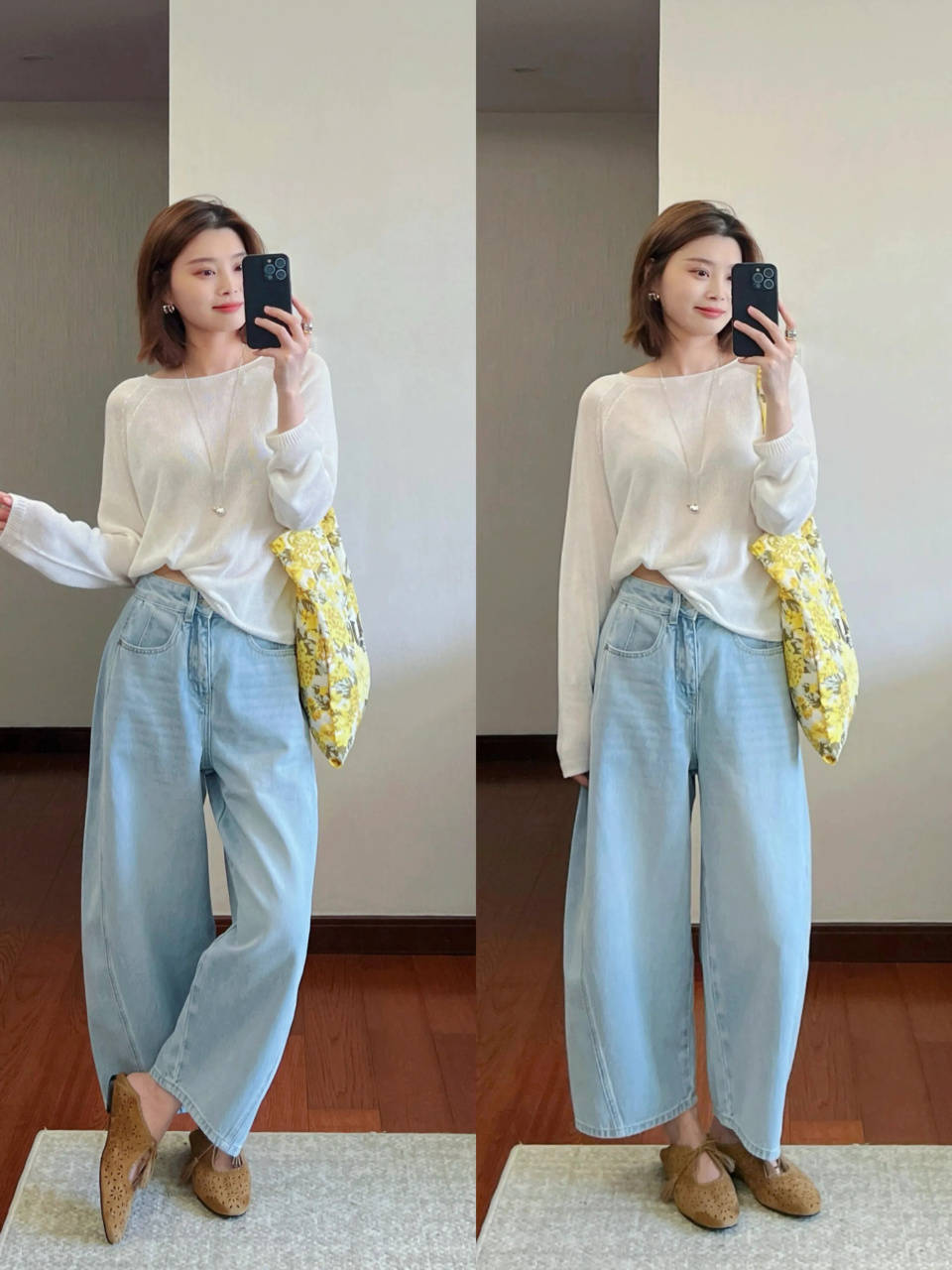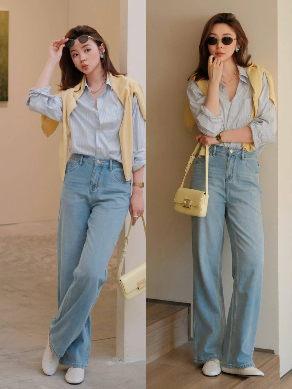Tips①:浅黄色针织上衣+蓝色牛仔镰刀裤