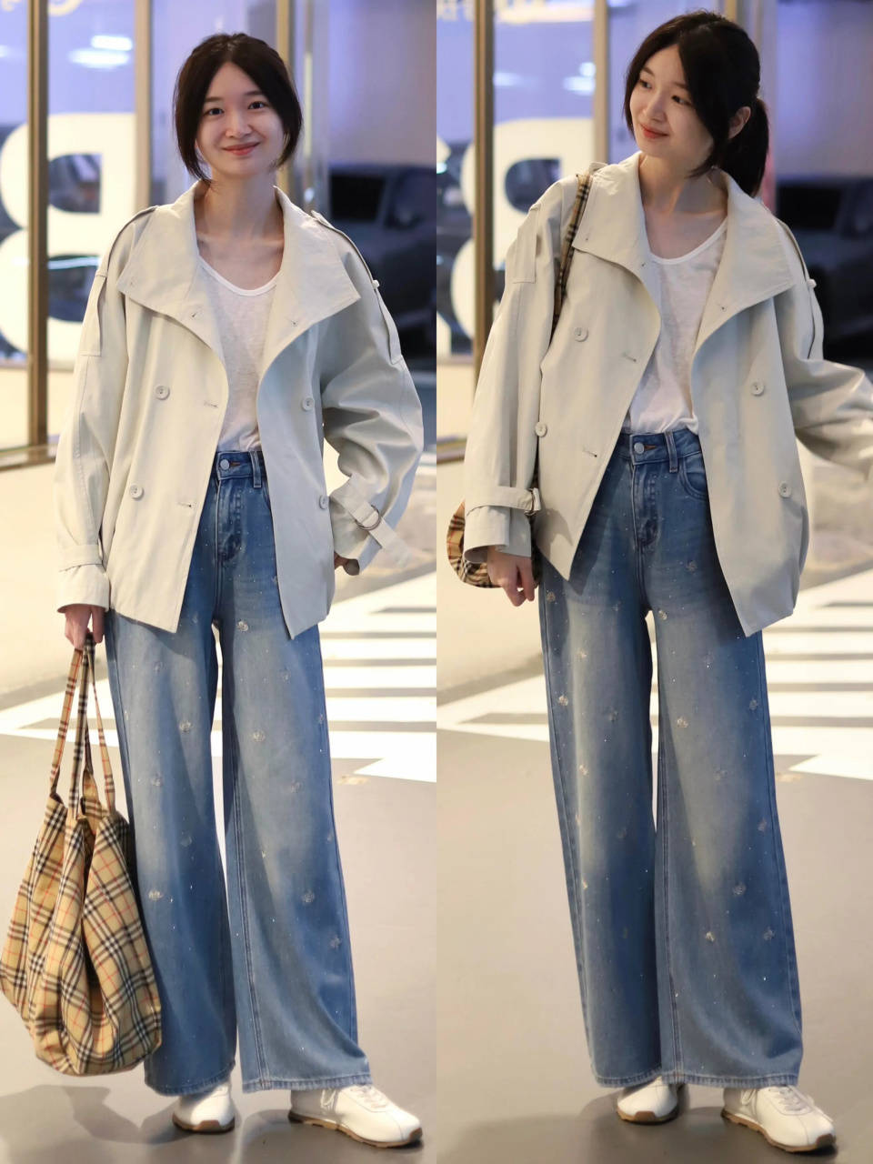 或是换成一件微宽松、挺阔有型的卡其色风衣外套,搭配上蓝色的牛仔阔腿裤,这样的穿搭显得更利落,比较有气场。