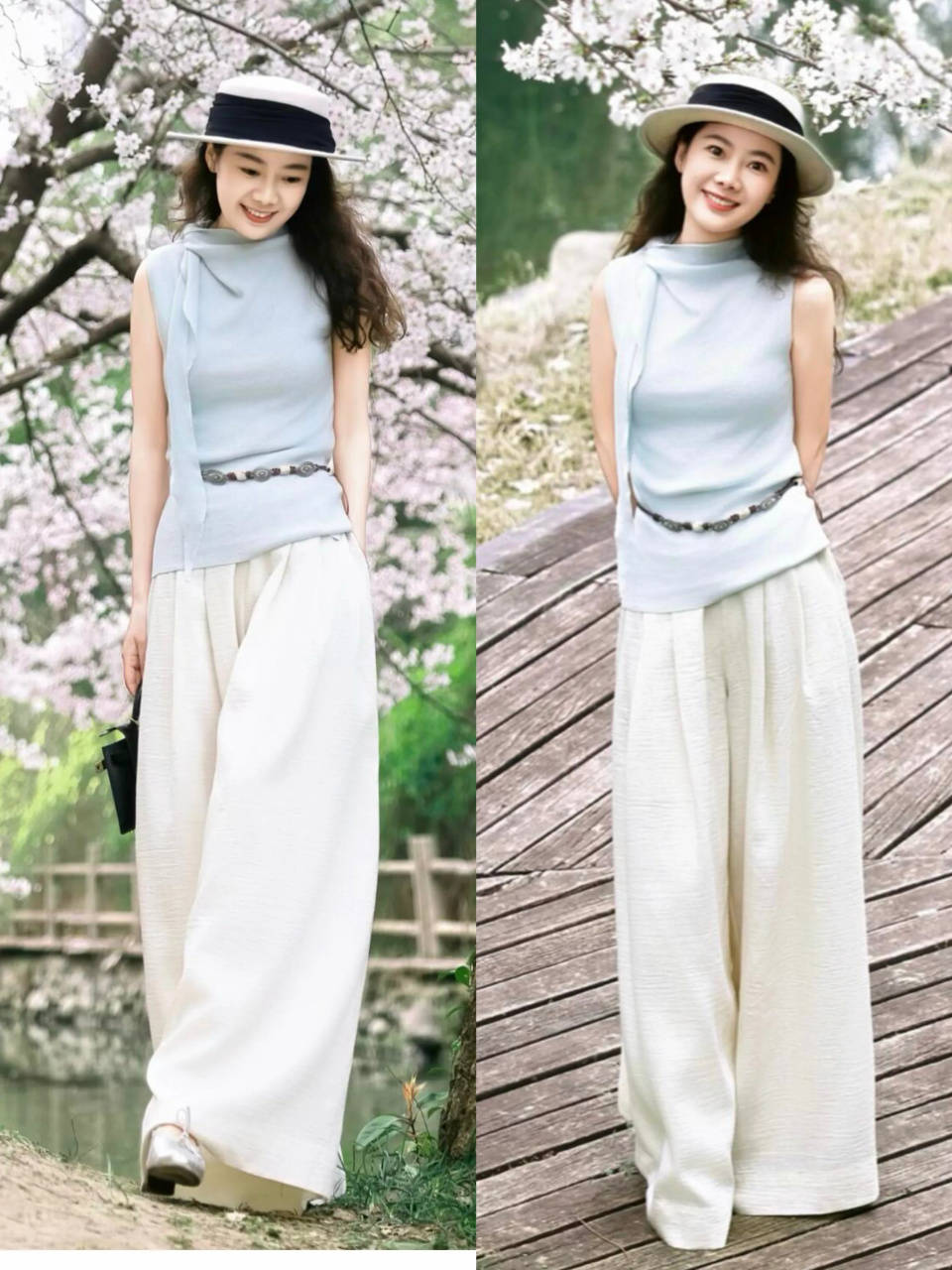和一件淡蓝色的针织无袖上衣组合,清新时尚,戴上一顶黑白拼接的草帽,增加造型的氛围感,出门旅游拍照特别出片的一身造型。