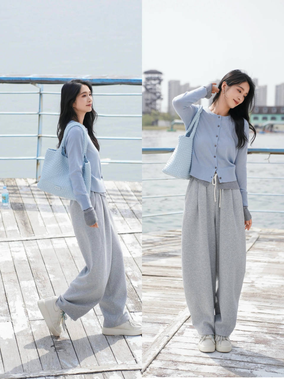 偏爱日常通勤风,可选一条灰色的休闲阔腿裤配上。雾霾蓝的针织开衫,脚踩一双小白鞋,这样的穿搭慵懒又俏皮,可盐可甜,很适合小个子女生穿搭。