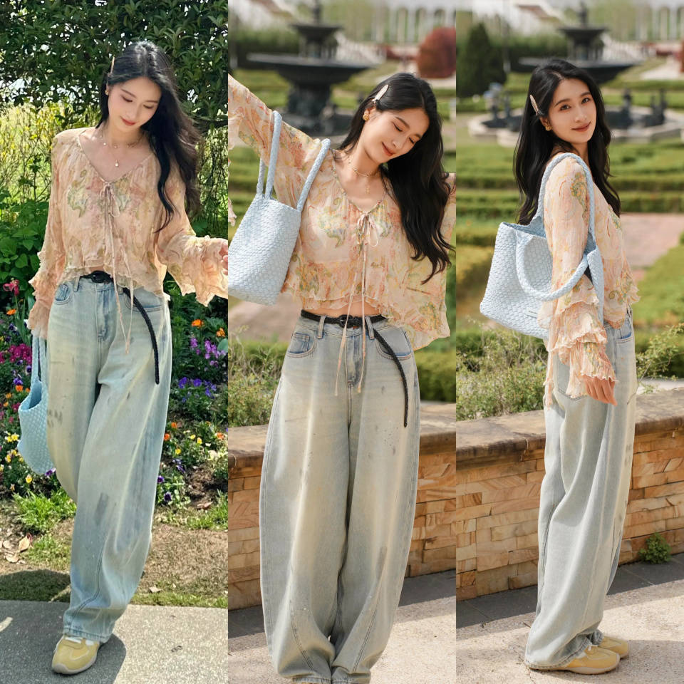 觉得穿一条牛仔裤过于单调的情况下,不妨可以选择一件印花的小众衬衫上衣,搭配上一条比较有垂坠感的蓝色牛仔阔腿裤,脚上穿了一双德训鞋,这样的打扮丰富了造型的配色,解决了穿衣打扮过于单调问题,日常穿搭出去逛街,简约又出彩。