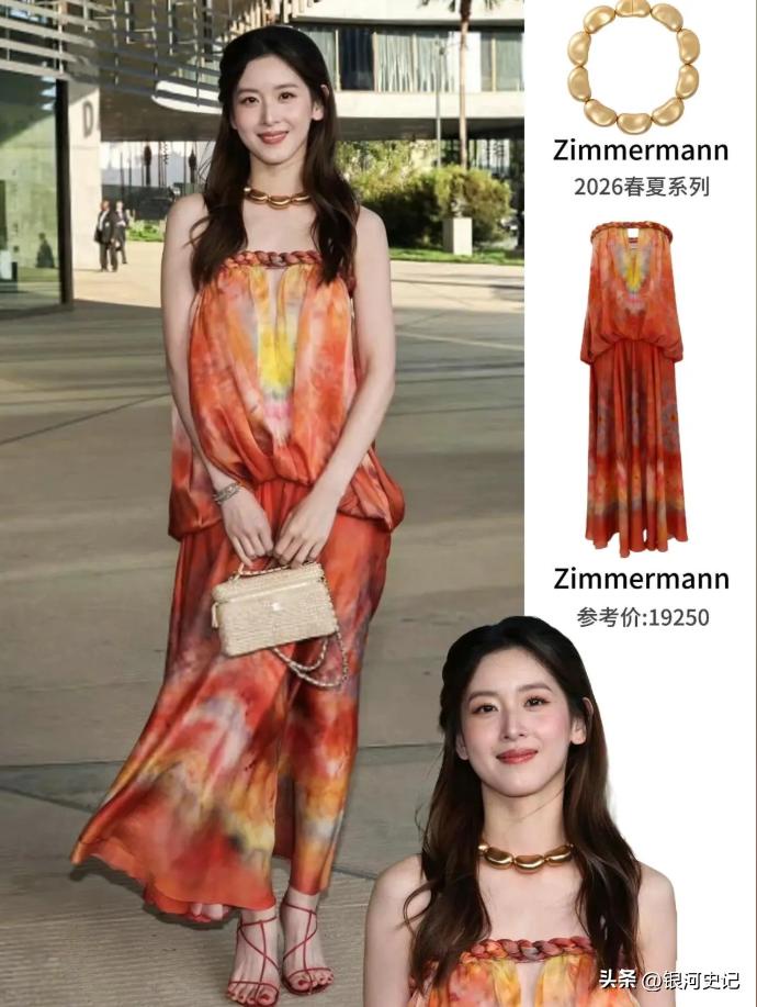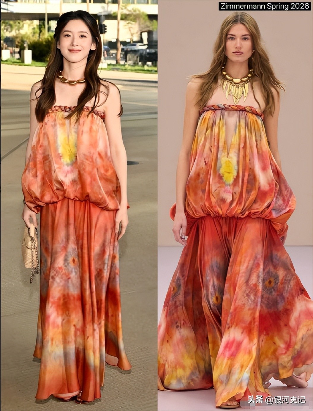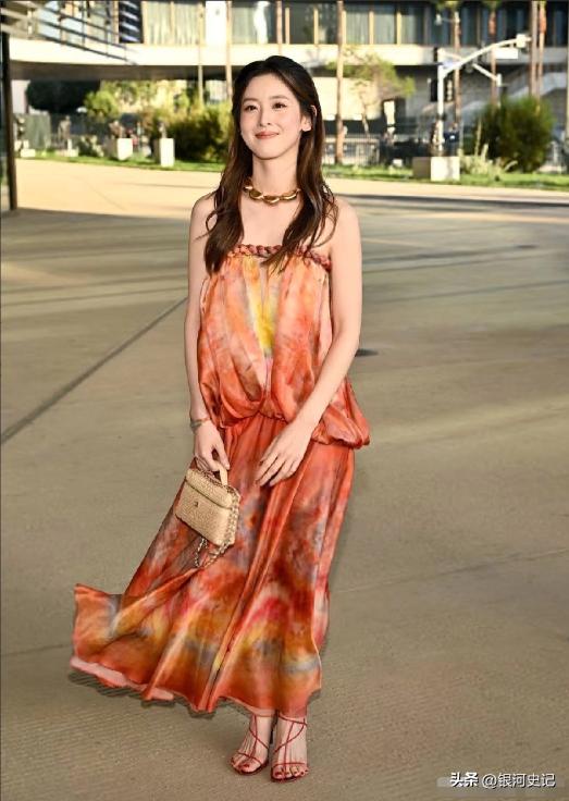 这条裙子的红黄晕染色调被网友形容为“把加州日落穿在了身上”,抹胸设计完美展现了她的肩颈线条,轻盈飘逸的面料随着微风拂动。