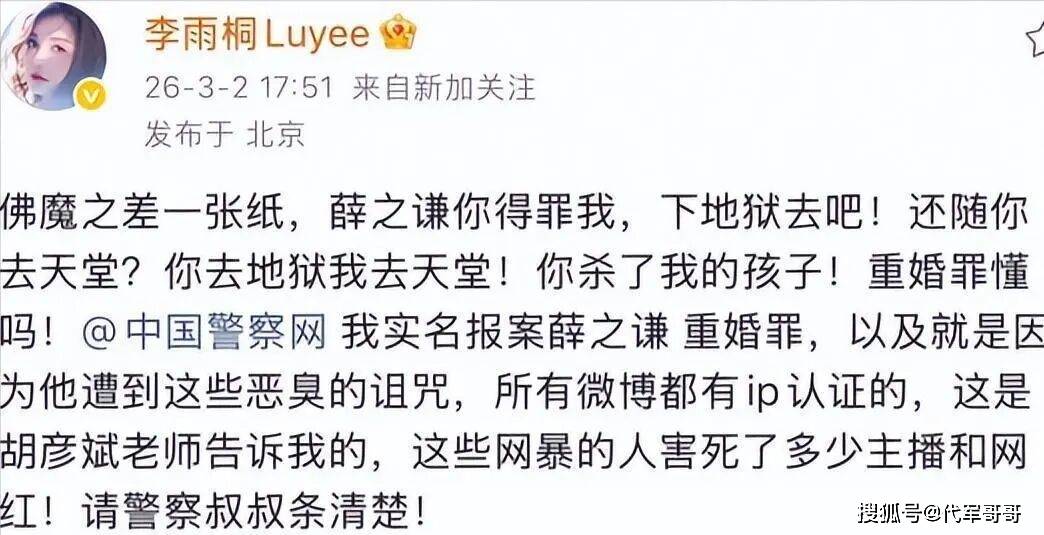 2025年,事件出现戏剧性反转,李雨桐在直播中公开表示,自己已与薛之谦达成和解,不仅称赞薛之谦“人很好”“值得喜欢”,还主动为其新歌宣传,与此前激烈控诉的态度形成鲜明反差,当时网友普遍认为两人近十年的恩怨已彻底了结。然而,这份“和解”并未持续太久,2026年3月2日,李雨桐突然再度在微博实名喊话薛之谦,态度彻底反转,言辞激烈地放狠话“今天我就一个个公开所有的真相”“君子报仇,十年不晚”,再度点燃这场跨越十年的恩怨。