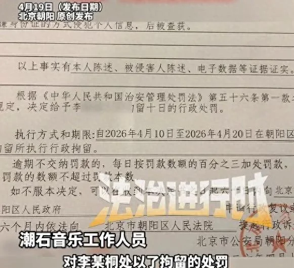 4月19日,据法治进行时报道,李某桐泄露薛之谦手机号、身份证号,被北京朝阳分局依法行政拘留。