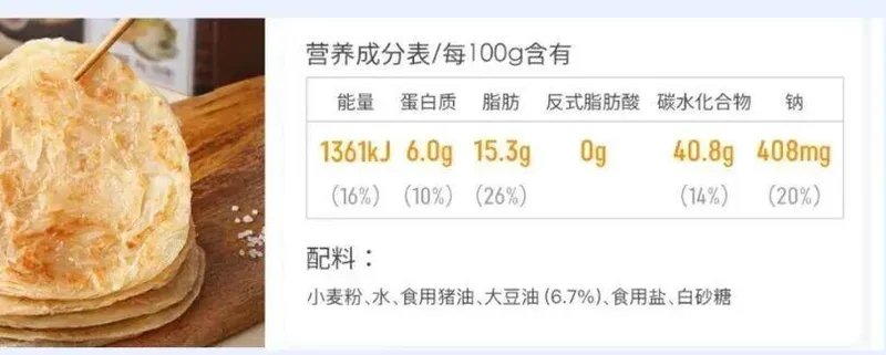 很多“0反式脂肪酸”的食品,比如某款手抓饼,虽然标有“0反式脂肪酸”,但总脂肪含量有15.3%,脂肪并不少。