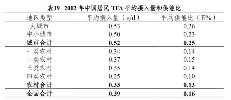 调查显示,中国人平均每天吃的反式脂肪是0.39克,相当于供能比为0.16%,城里人比农村人吃得多一些,平均供能比是0.25%,在北京、广州这些城市,反式脂肪的供能比也只有0.34%,远低于WHO的建议值。
