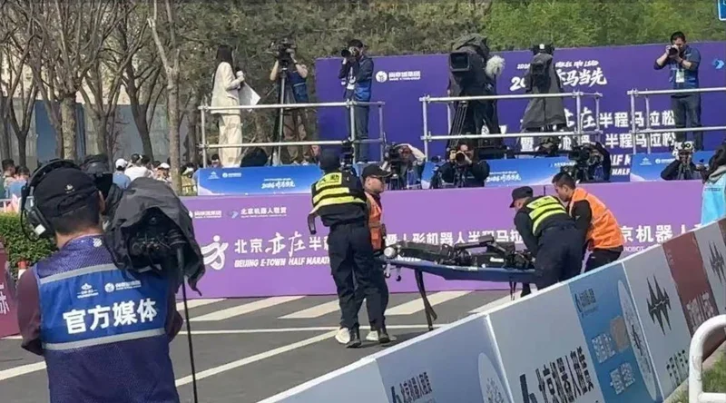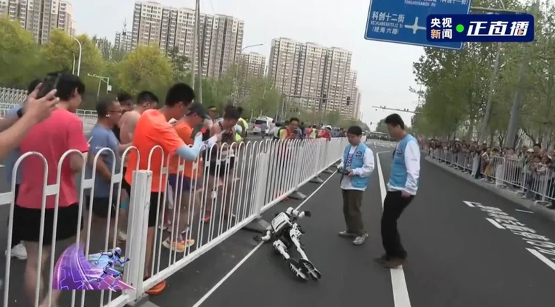 有些机器人选手属于重在参与,发令枪响没多久,还没跑出几百米,自己就开始脚步不稳、步履蹒跚,一头创在围栏上,直接在路边瘫软成了一堆废铁。