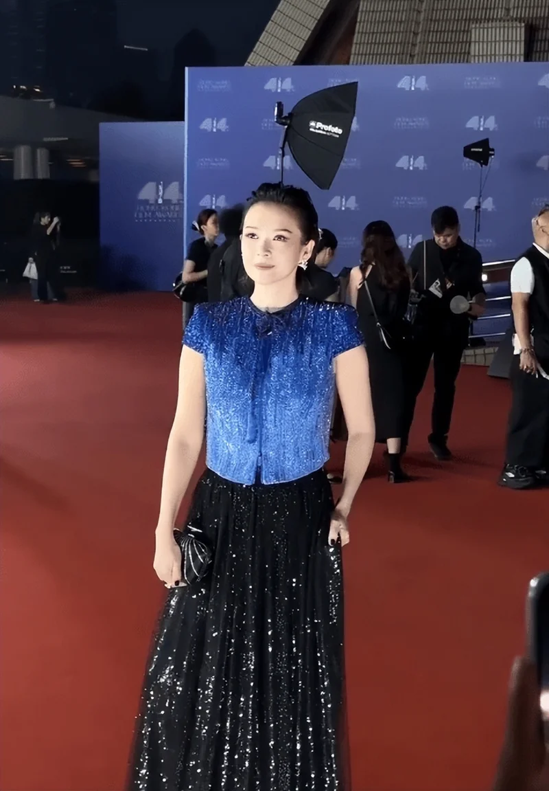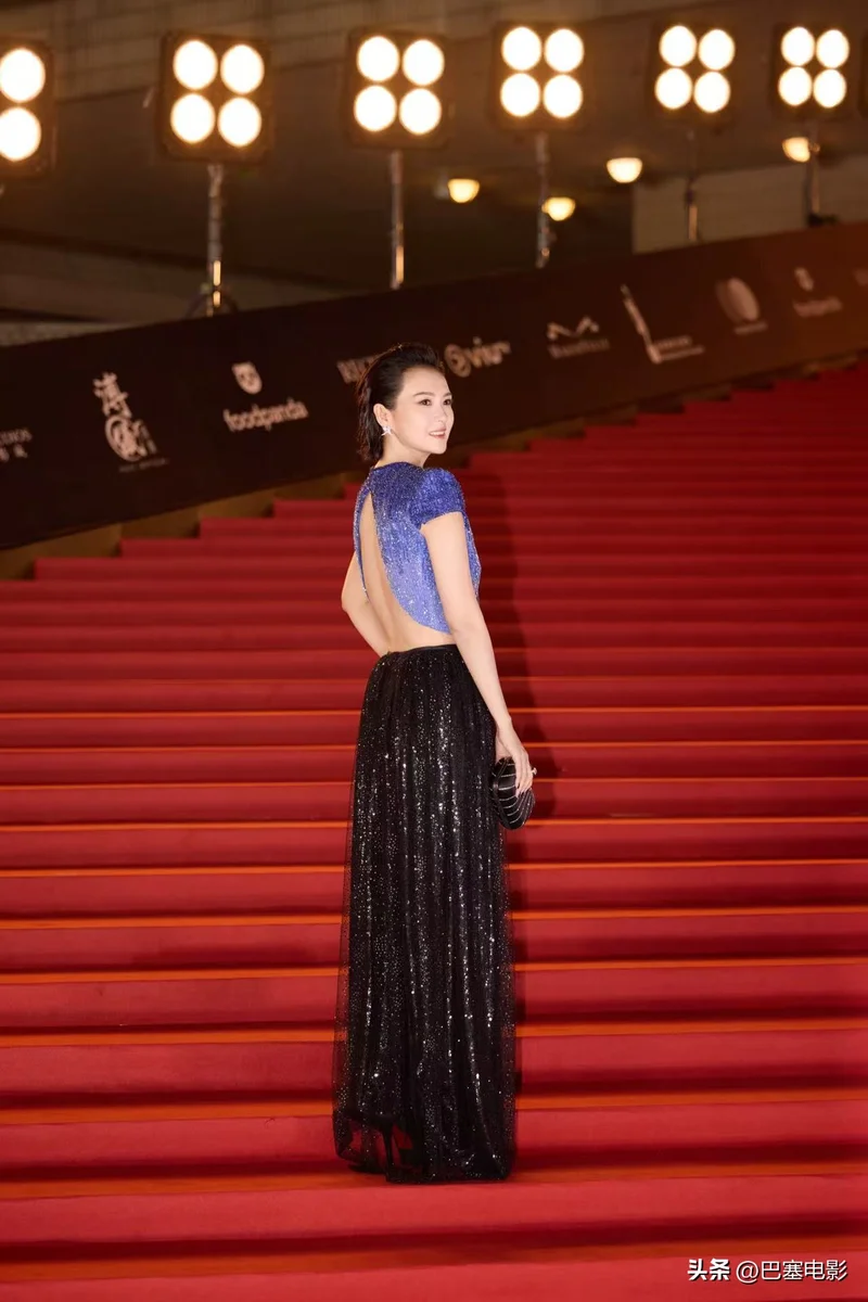章子怡蓝色渐变夹克搭配黑色亮片纱裙,华丽高贵,气场全开。