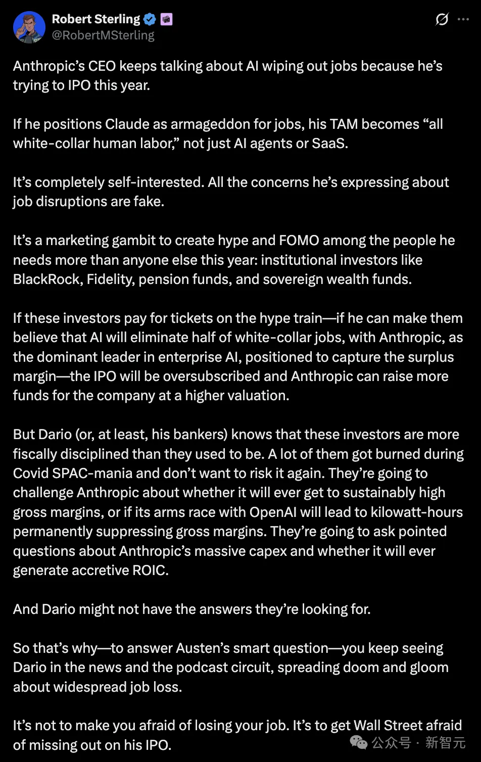 他天天喊着「AI毁掉白领工作」,真正想吓到的根本不是打工人,而是生怕错过下一个工业革命的华尔街资本。