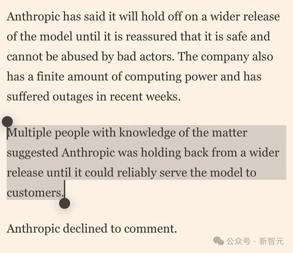 FT引述多位知情人士的爆料,戳破了这一神话:真正拖慢模型广泛发布的,与其说是「太危险不敢放」,不如说是「太吃资源,根本带不动」。
