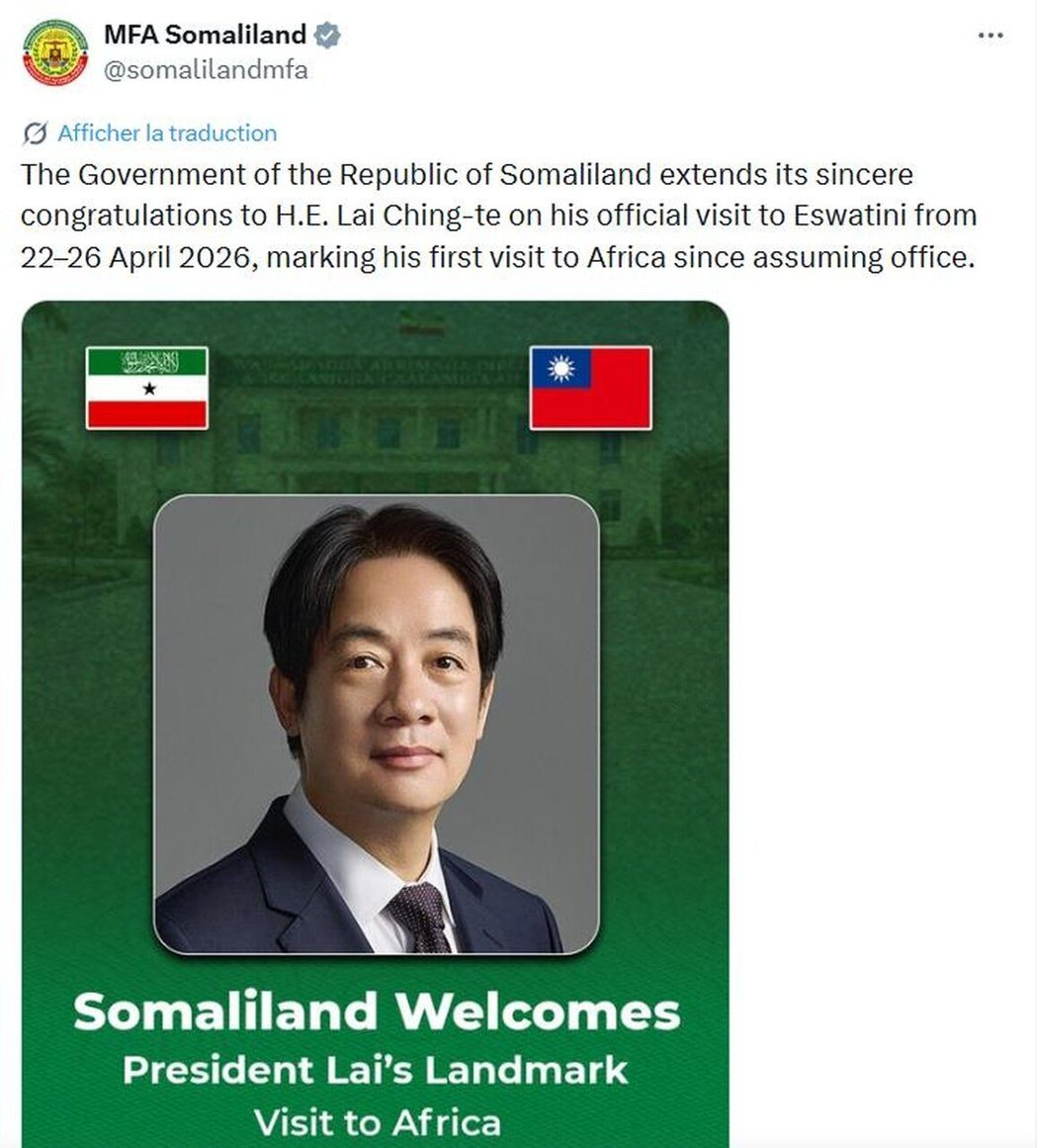 索马里兰贴文表示,索马里兰共和国政府诚挚祝贺赖清德总统阁下于2026年4月22日至26日正式访问史瓦帝尼,此行是赖总统上任以来首次访问非洲。”