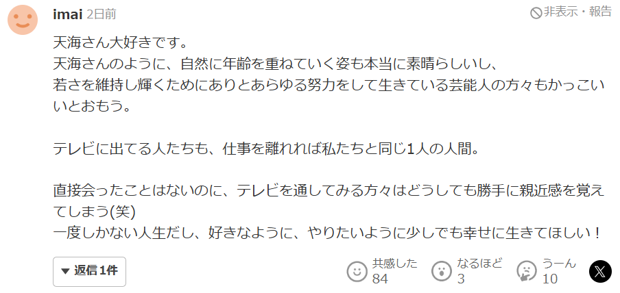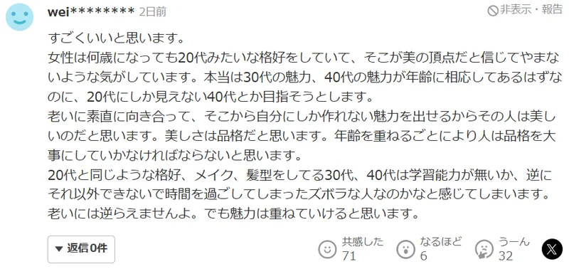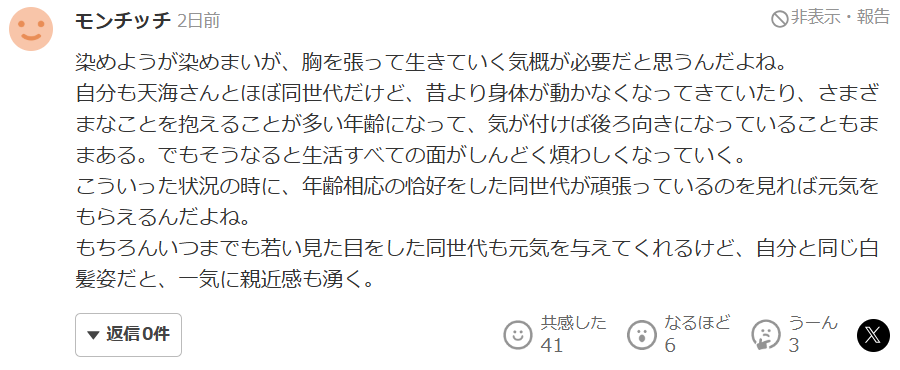 对此,日本网友纷纷表示天海佑希不愧是女王大人,能如此自然地面对自己的老去,这样对待生命的态度真是太酷了。“我觉得特别好。我感觉女的不管多大岁数,都一直坚信打扮得像二十来岁就是美的巅峰。其实三十岁有三十岁的魅力,四十岁有四十岁的魅力,可有些人明明四十了,还非得打扮得像二十岁似的。我觉得人要是能坦然面对衰老,然后展现出只有自己才有的魅力,那这个人就很美。我觉得美就是一种品格。我觉得人随着年龄增长,就得越来越重视品格。