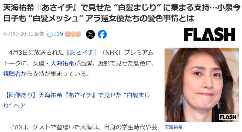 在NHK早间节目《あさイチ》中,天海佑希作为2026新年度首位PremiumTalk嘉登场。节目结束后,主播铃木奈穗子在官方IG释出的幕后合照却引发了大量的讨论,原因竟是天海佑希的一头黑发中夹杂着一些肉眼可见的白发。
