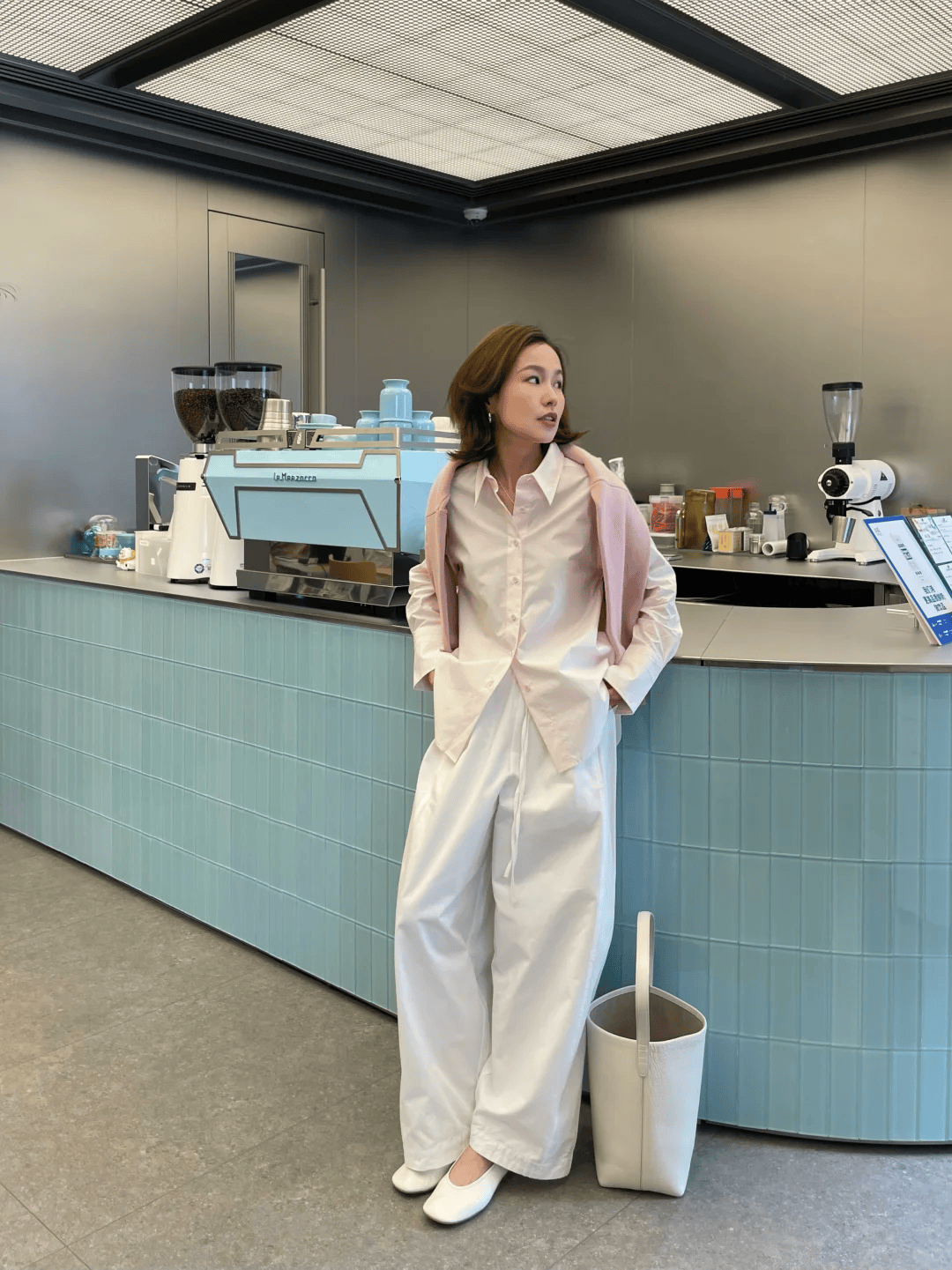 裸粉色衬衫版型宽松柔和,不挑身材还能巧妙遮住腰腹小赘肉,温柔又显气色。搭配垂坠感十足的白色阔腿裤,整体清爽干净,自带温柔高级的松弛氛围。高腰设计拉长下半身比例,显瘦显高,整套搭配舒适自在,很适合40+女性初夏穿出优雅气质。