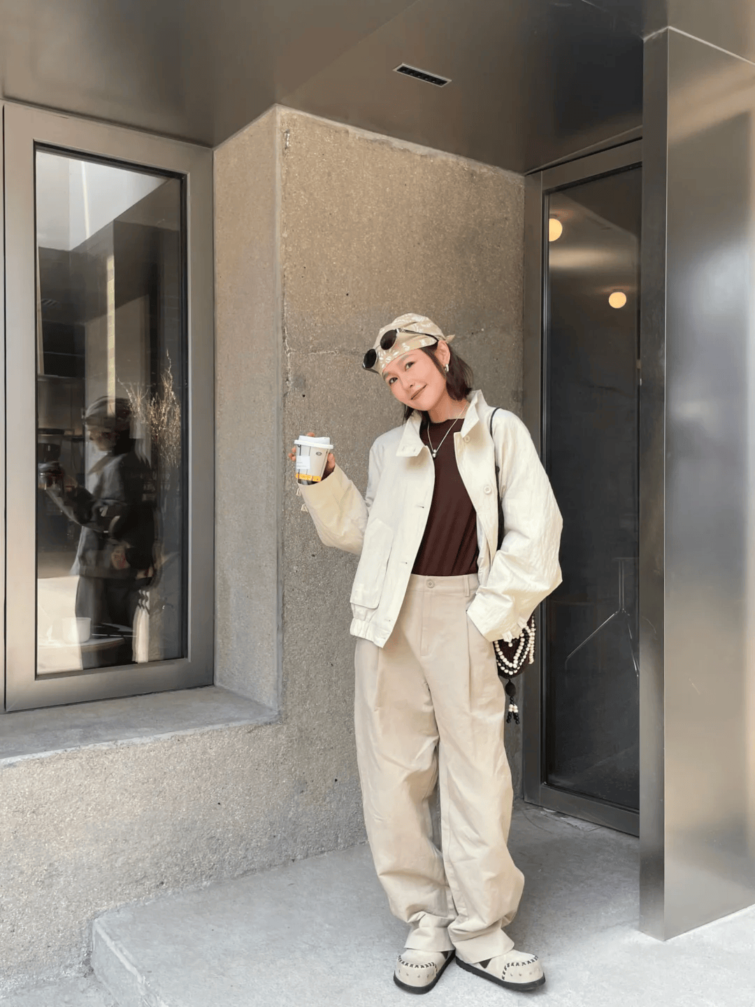 米色短夹克搭配褐色T恤打底,下身再配一条卡其色高腰休闲裤,整体配色温柔又协调。宽松版型的夹克对身材包容度很高,轻松藏住腰腹赘肉,遮肉显瘦效果绝佳。卡其裤随性舒适,自带慵懒氛围,整套穿搭简约不刻意,松弛感与高级感兼备,特别适合40+女性初夏日常穿着。