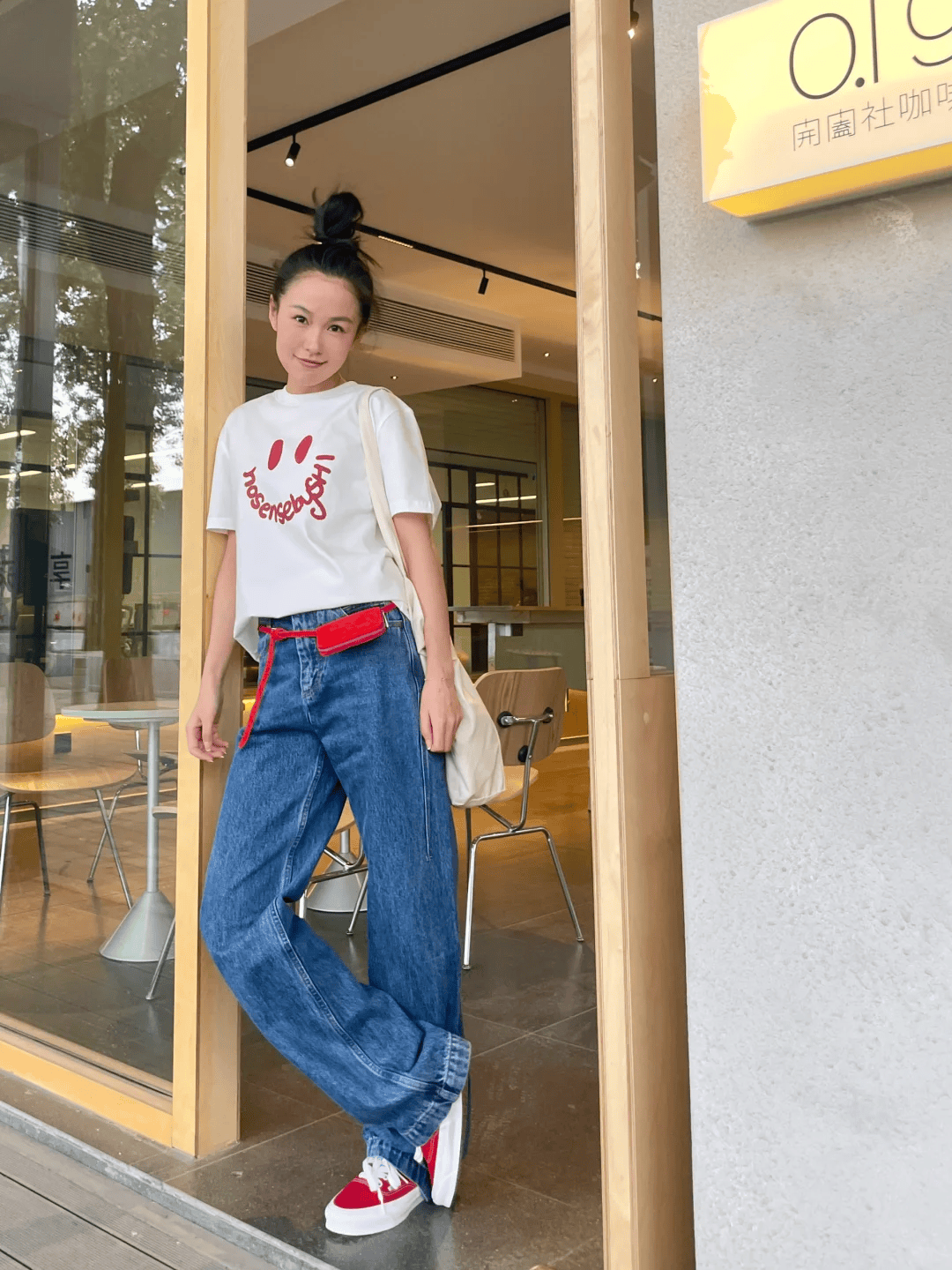 T恤同样是初夏季节的主流单品,四十岁的女性如何选择T恤很重要,首先面料一定要舒适透气,像纯棉、棉麻等面料就非常不错,可以适当的选择印花款,但是图案要尽量简约,版型不要太紧绷,比如这套白色印花T恤+蓝色牛仔裤,红色帆布鞋点缀,与腰带色彩相呼应,色彩搭配舒适又清新。