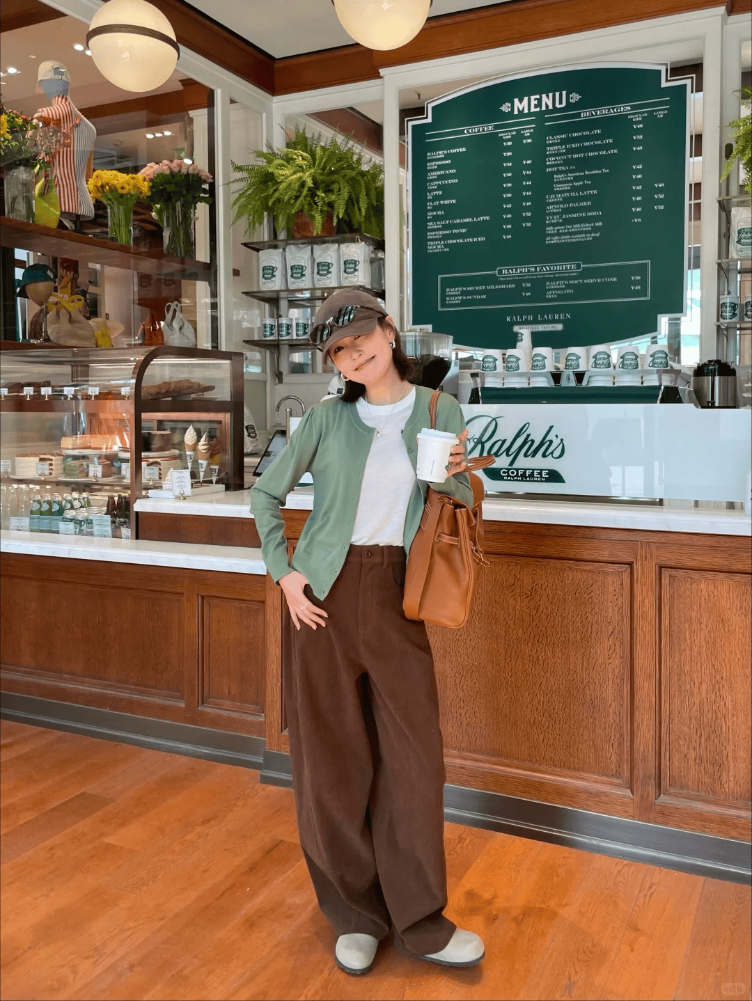 灰绿色针织小开衫软糯亲肤,作为初夏外搭再合适不过,自带温柔又沉静的气质。内搭白 T 简约干净,与深棕色高腰阔腿裤形成利落对比,上短下长的穿搭法则优化身材比例,轻松遮肉显瘦、拉长腿部线条。整体舒适随性又不失质感,尽显40+女性的从容与高级。