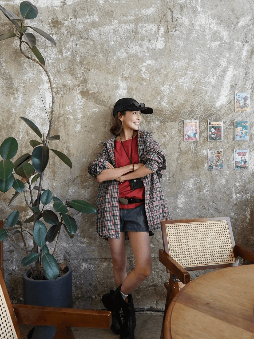 衬衫也是初夏季节的主流单品,红色T恤+深灰色休闲短裤,再套一件红灰格纹衬衫,oversizes版型,不但又非常不错的遮肉显瘦效果,还能打造下衣失踪穿法,整体造型松弛却不松垮,慵懒又透露满满的高级,鞋子可以选择黑色运动鞋,或者短款马丁靴,都超级好看。