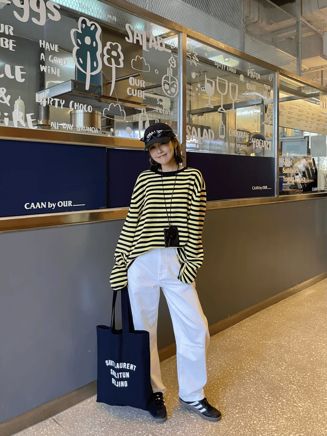 条纹衫绝对是初夏穿搭的百搭神器,轻松拿捏随性氛围感。黄黑条纹长袖清爽亮眼,不挑肤色还很衬气色,搭配亮白色休闲裤干净利落,再配上黑色德训鞋与帆布包,色彩呼应协调。整体简约休闲,舒适自在,显瘦又显活力,很适合40+女性穿出减龄高级感。