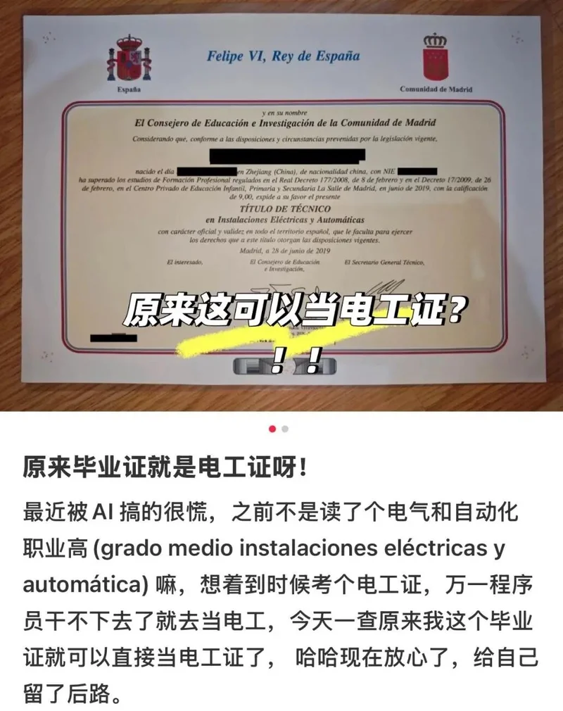 远在西班牙马德里的袁峰,也在未雨绸缪。上个月,他从床底的盒子里翻出一张泛黄的纸,那是他7年前考取的中等职业技术教育毕业证书,专业栏上写着“电气与自动化装置”。在西班牙,这张证书代表着可以合法当电工,无需再考执照。