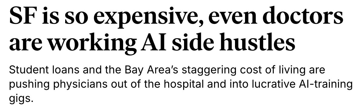 一名来自门洛帕克的内科医生透露,自己年薪约31万美元,但依然背负着巨额学贷。“我每周工作60小时,但在湾区,连买房都很困难。”他今年开始接触AI训练副业,通过晚上或周末完成任务来增加收入。“这份工作时间灵活,可以让我稍微喘口气。”