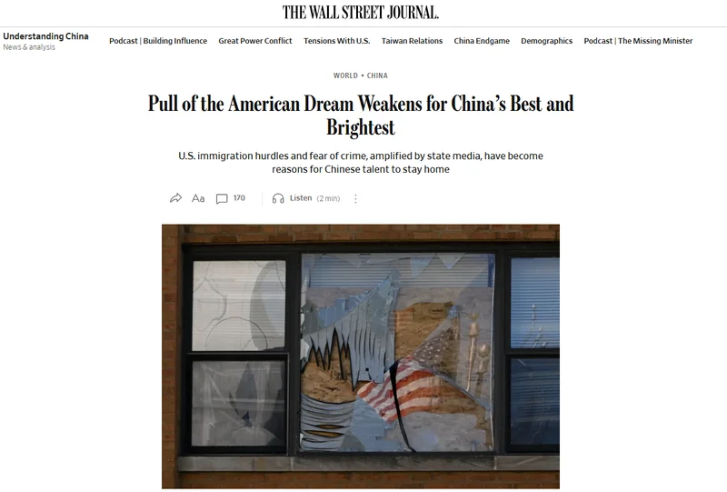 过去几十年来,中国人逐渐形成并不断强化一个认知,即美国是一个混乱而危险的地方。美媒《华尔街日报》4月18日刊文称,美国对中国的吸引力减弱,导致人才流失。