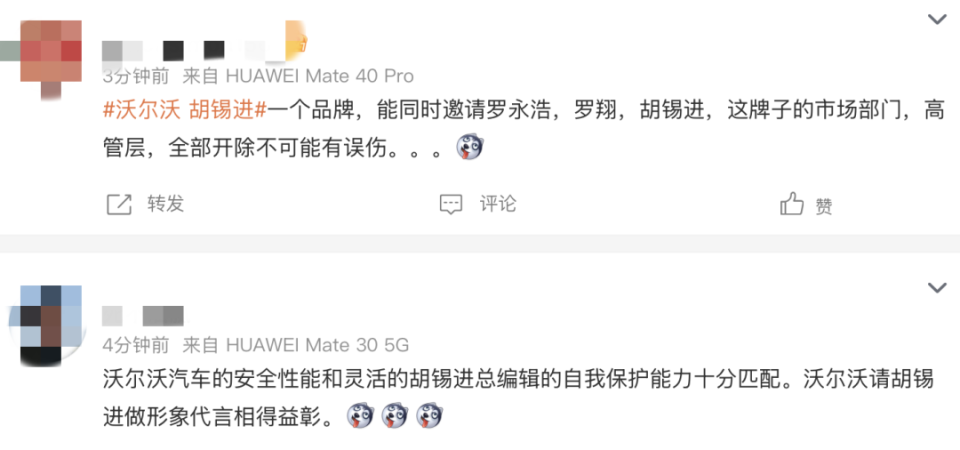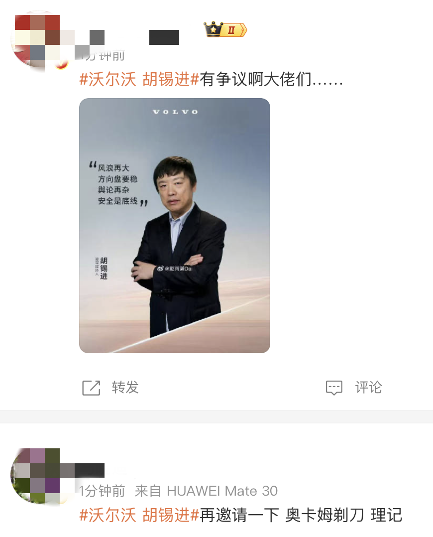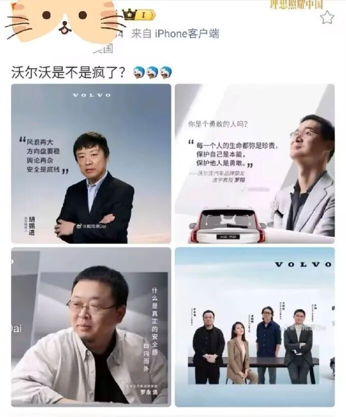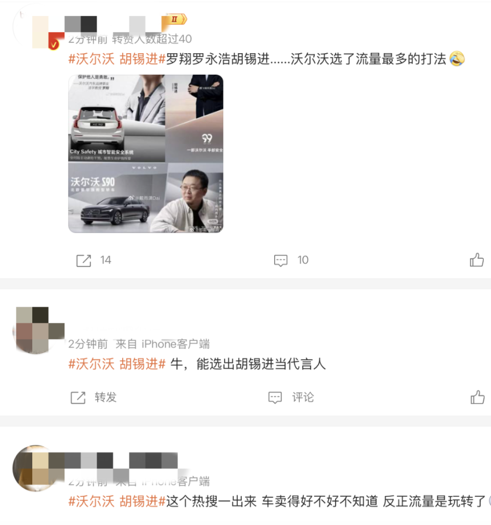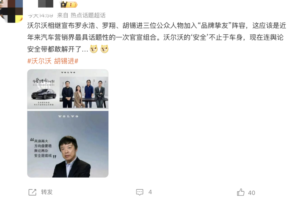 “继罗翔、罗永浩之后,沃尔沃又选中了胡锡进,不知道该说什么好,沃尔沃公关部门绝对有“高人”,中国舆论场三大顶流KOL,居然同属一个汽车品牌,沃尔沃再次把“安全”的品牌溢价,传递给广大网友。”某微博网友。
