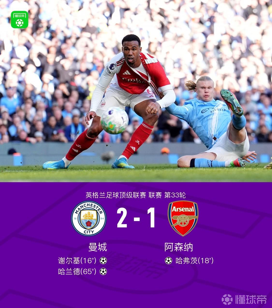 北京时间4月19日英格兰足球顶级联赛 联赛 第33轮,曼城主场对阵阿森纳。上半场,谢尔基连过数人后破门。不过,多纳鲁马出现巨大失误,哈弗茨将球挡进球门,枪手迅速扳平比分。下半场,哈兰德破门。全场比赛结束,曼城2-1击败阿森纳,在少赛一场的情况下,距离对手只差3分。