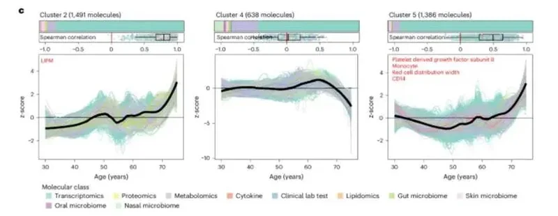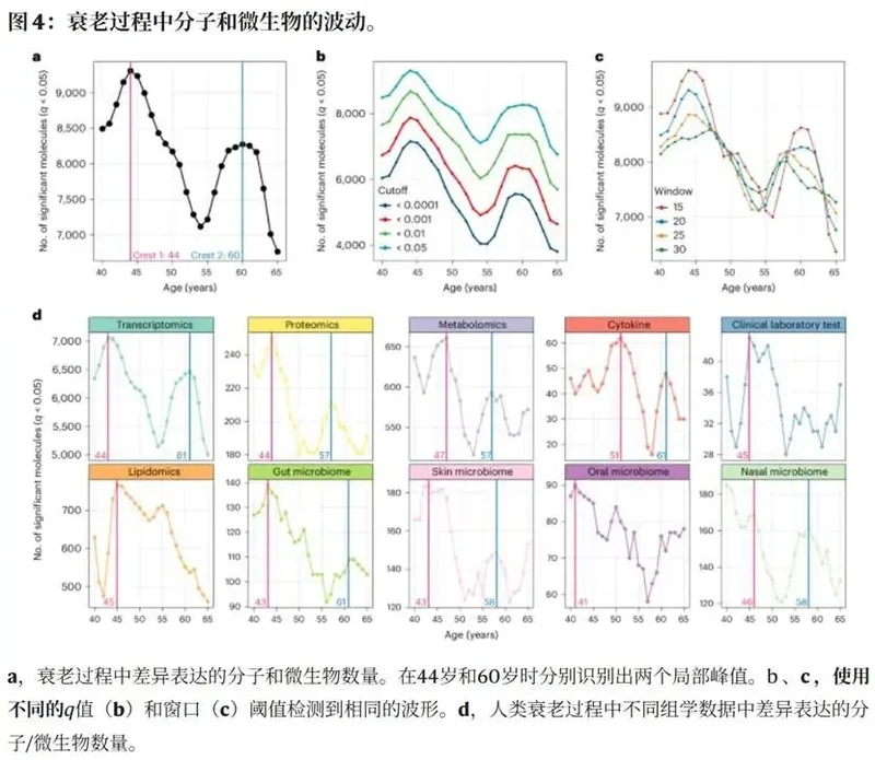 文章指出人体内约81%的分子(包括蛋白质、RNA和代谢物)都表现出了非线性的波动,而且这些分子的剧烈变化并非随机分布,而是集中在两个时间段:44岁左右(第一波峰)和60岁左右(第二波峰)。