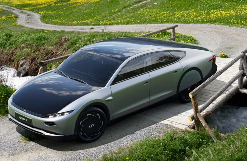这车叫 Lightyear 0,是全球第一辆量产的太阳能汽车,为了美观侧面没贴 “牛皮藓”,太阳能板安装在了前舱盖、车顶、溜背上,面积是 5m²,户外停一天能补充 70km 续航。