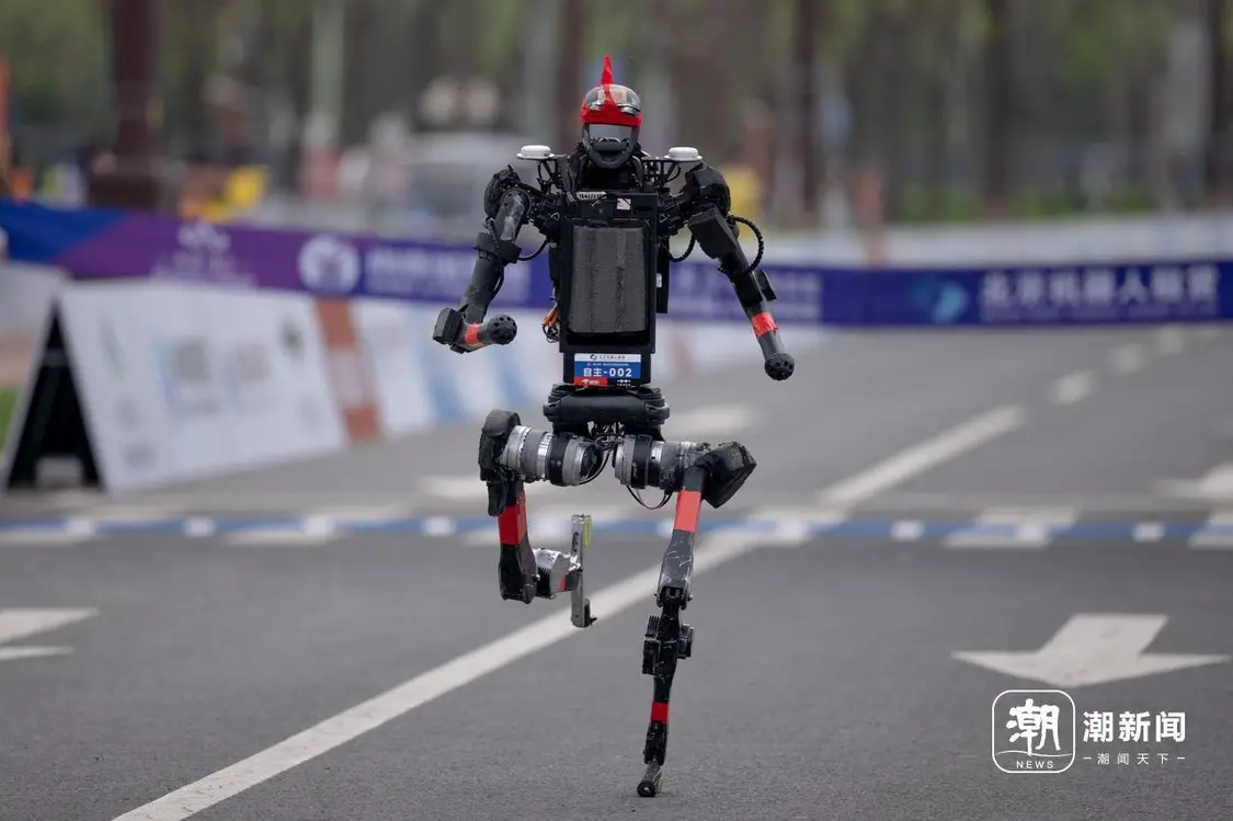今年反过来了。赛道边有人冲着人类选手喊“加油,超它!”——超的对象是跑在前面的机器人。