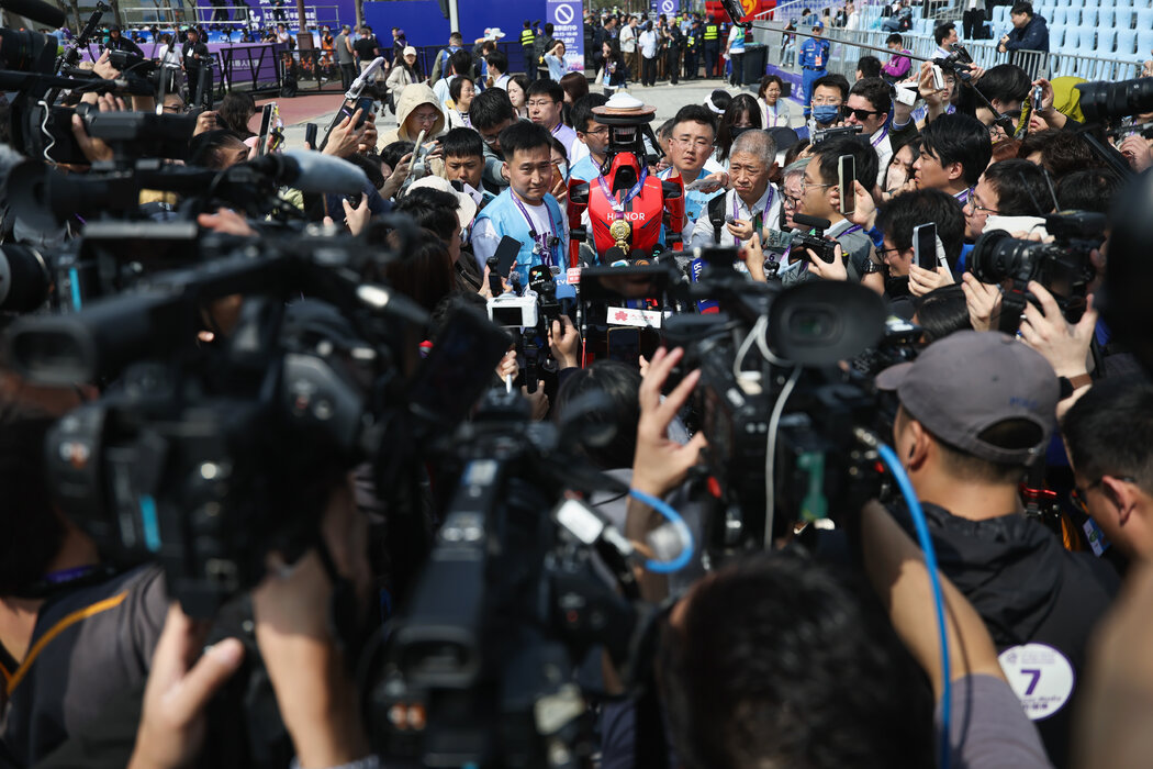 比赛结束后,媒体记者蜂拥而至,簇拥着这台获胜的机器人及其设计团队,这台机器人由中国智能手机制造商荣耀的团队研发。 LINTAO ZHANG/GETTY IMAGES