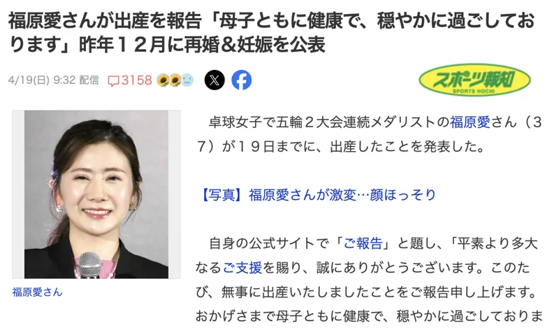4月19日,福原爱通过官方网站低调发文,宣布自己已经顺利生产,并表示“母子平安,目前过着平静安稳的生活”。