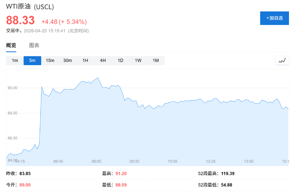 自美伊开战已过去五十天,停火形势在本周末再度急剧恶化。此前据央视国际时讯,伊朗伊斯兰革命卫队海军当地时间18日晚宣布,由于美国违反停火协议、并未解除对伊朗船只和港口的封锁,霍尔木兹海峡即刻关闭,直至美方封锁解除。特朗普称伊朗周末的一系列行动是对停火协议的"彻底违反",并威胁若德黑兰拒绝谈判,将对其发电厂和桥梁实施打击。截至发稿,WTI原油期货涨逾5%,至每桶88美元;国际基准布伦特原油上涨5.6%,至每桶95.50美元。