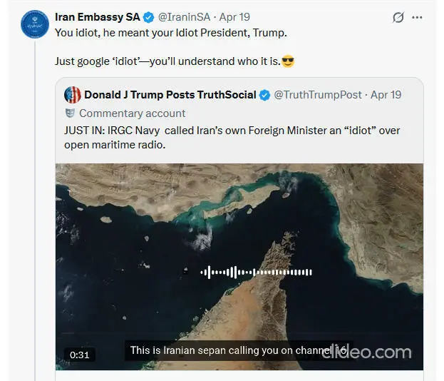 伊朗驻南非大使馆4月19日在X上转发了相关帖子,并评论道:“你个白痴,他指的是你们那个白痴总统,特朗普。谷歌一下‘白痴’,你就知道是谁了。”