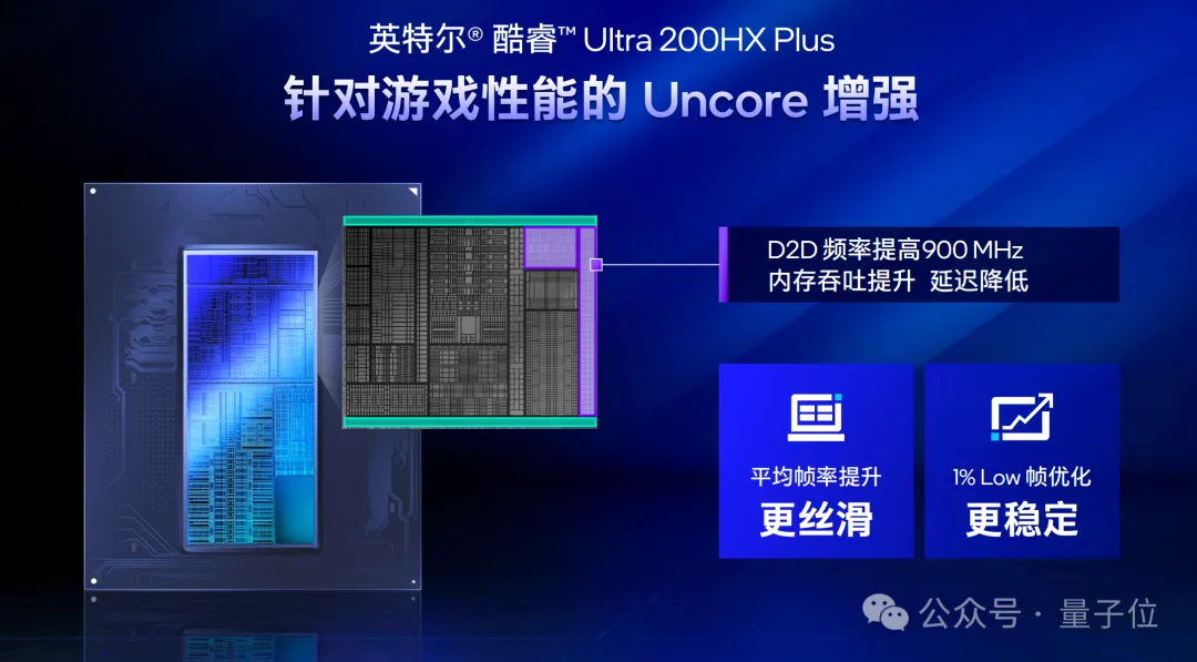 在架构层面上,本次200HX Plus重点强化Uncore游戏性能,通过提升晶粒间(D2D)频率900MHz至3GHz,突破Arrow Lake多Chiplet架构通信瓶颈。