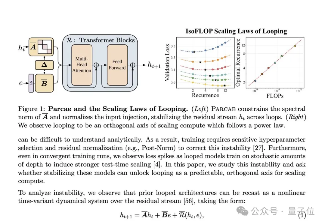 来自UCSD和Together AI的新论文Parcae: Scaling Laws For Stable Looped Language Models提出LTI稳定循环注入让每轮不发散。