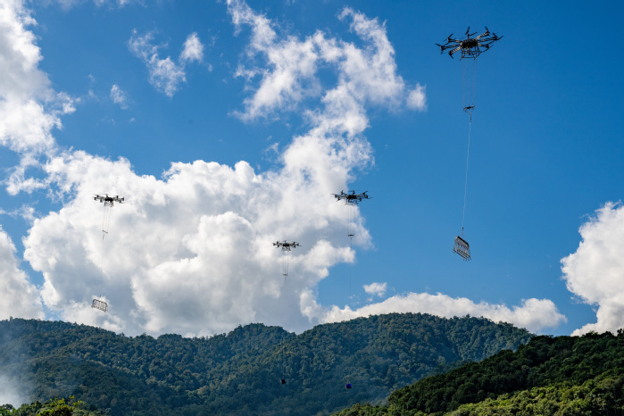 施工过程中,中老500千伏联网工程国内段工程运用无人机集群作业方式开展施工物资运输。