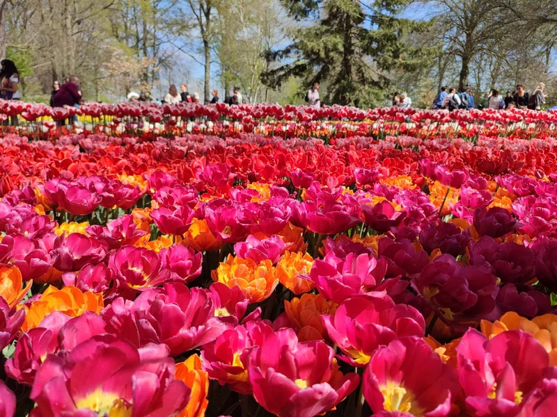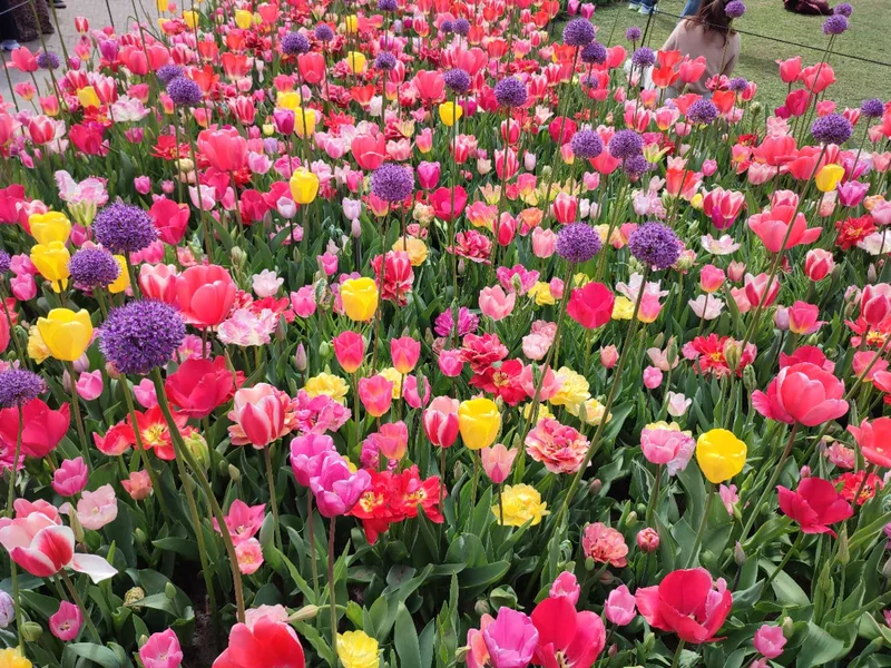 园子里的花正开着。不同颜色的郁金香分区种植,一片一片,看得很清楚。花上还带着些露水,太阳出来后,很快就散了。深红、金黄、淡紫等等五颜六色顺着地势铺开,在转角处自然接在一起,也不显得突兀。