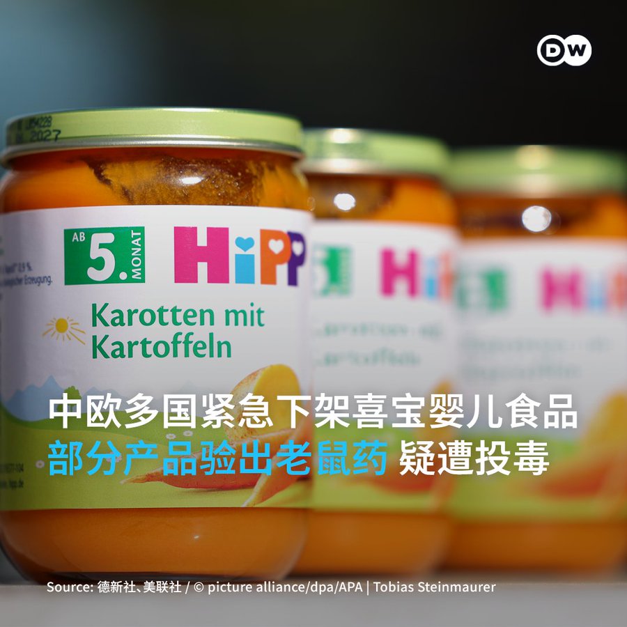 中欧多国紧急下架德国知名婴儿食品品牌喜宝(HiPP)的一款产品,此前在奥地利、捷克和斯洛伐克的样本中检出老鼠药成分,当局已将事件列为刑事案件调查。