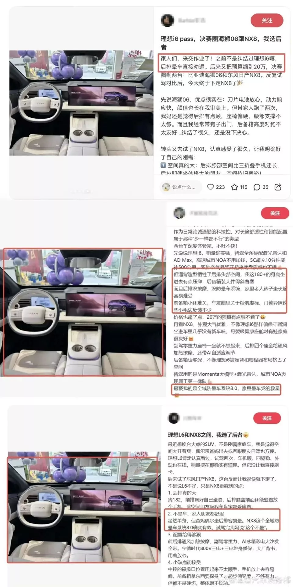 打开各种社交平台搜索“理想L6还是NX8”,扑面而来的是海量对比帖。文案千篇一律,结论高度统一,评论区整齐划一地刷着“选了NX8”“放弃理想”。他一条条翻看着,越看越觉得,既然都有这么多人都选它,应该不会错。