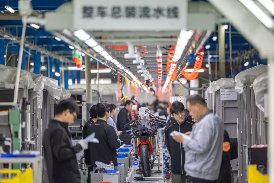 2026年4月1日,工作人员在重庆两江新区“张雪机车”生产车间整车总装流水线上作业(图:新华社)