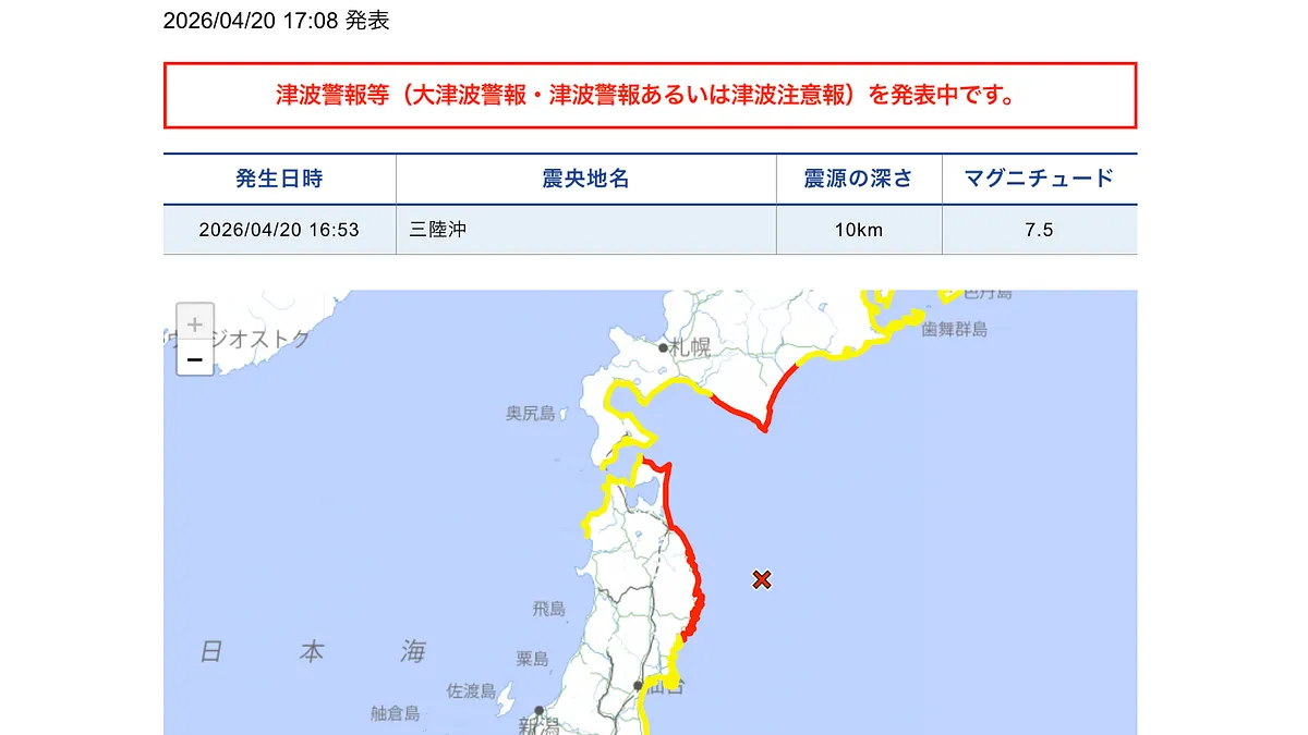2026年4月20日,日本三陆冲发生规模7.5强震后,日本气象厅紧急发布海啸警报。(翻摄日本气象厅)