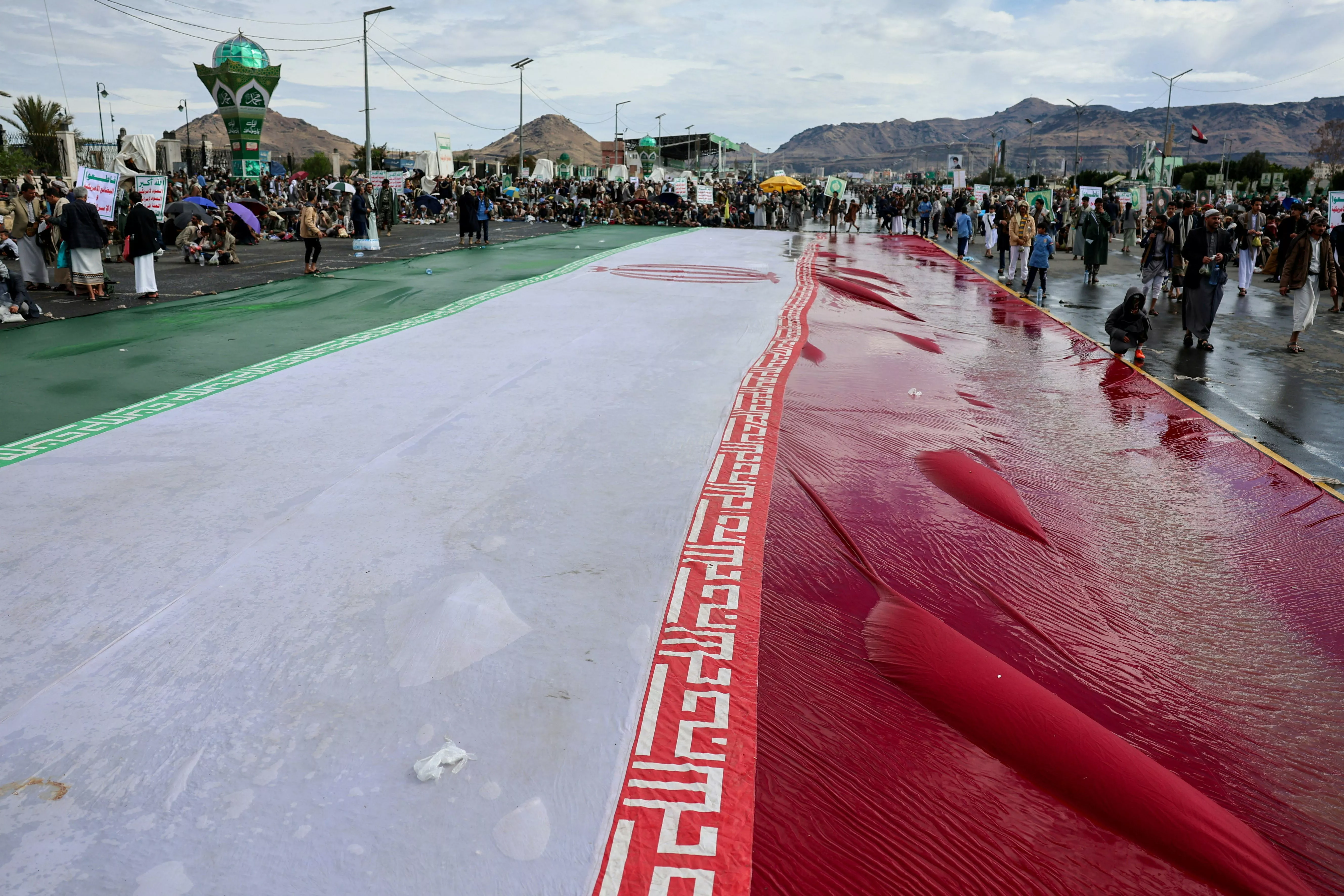 2026年3月27日,在也门首都萨那,一面巨大的伊朗国旗横卧在胡塞武装支持者声援伊朗的集会现场。此时,美以冲突仍在持续。 (Reuters)